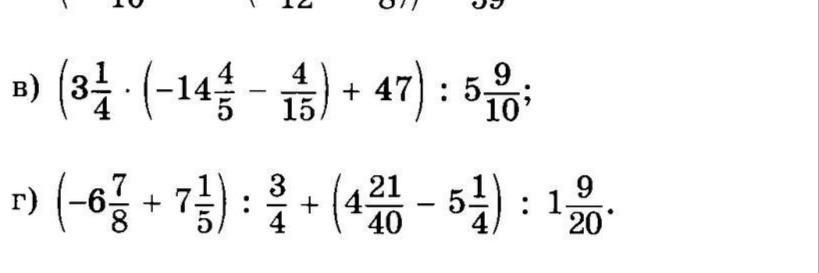 в) (3 1/4*(-14 4/5-4/15)+47):5 9/10=(13/4*(-14 12/15-4/15)+47):59/10=