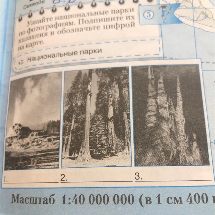 1) Национальный парк Сноудония находиться в Великобритании. 2) Национальный парк Редвуд или Секвойя обе находятся в Калифорнии. 3) Национальный парк Какаду находится в Австралии.