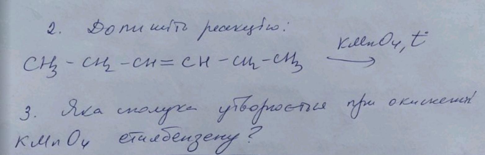 3CH3-CH2-CH=CH-CH2-CH3 + 8KMnO4 = 6CH3-CH2-COOK + 8 MnO2 + 2H2O + 2KOH