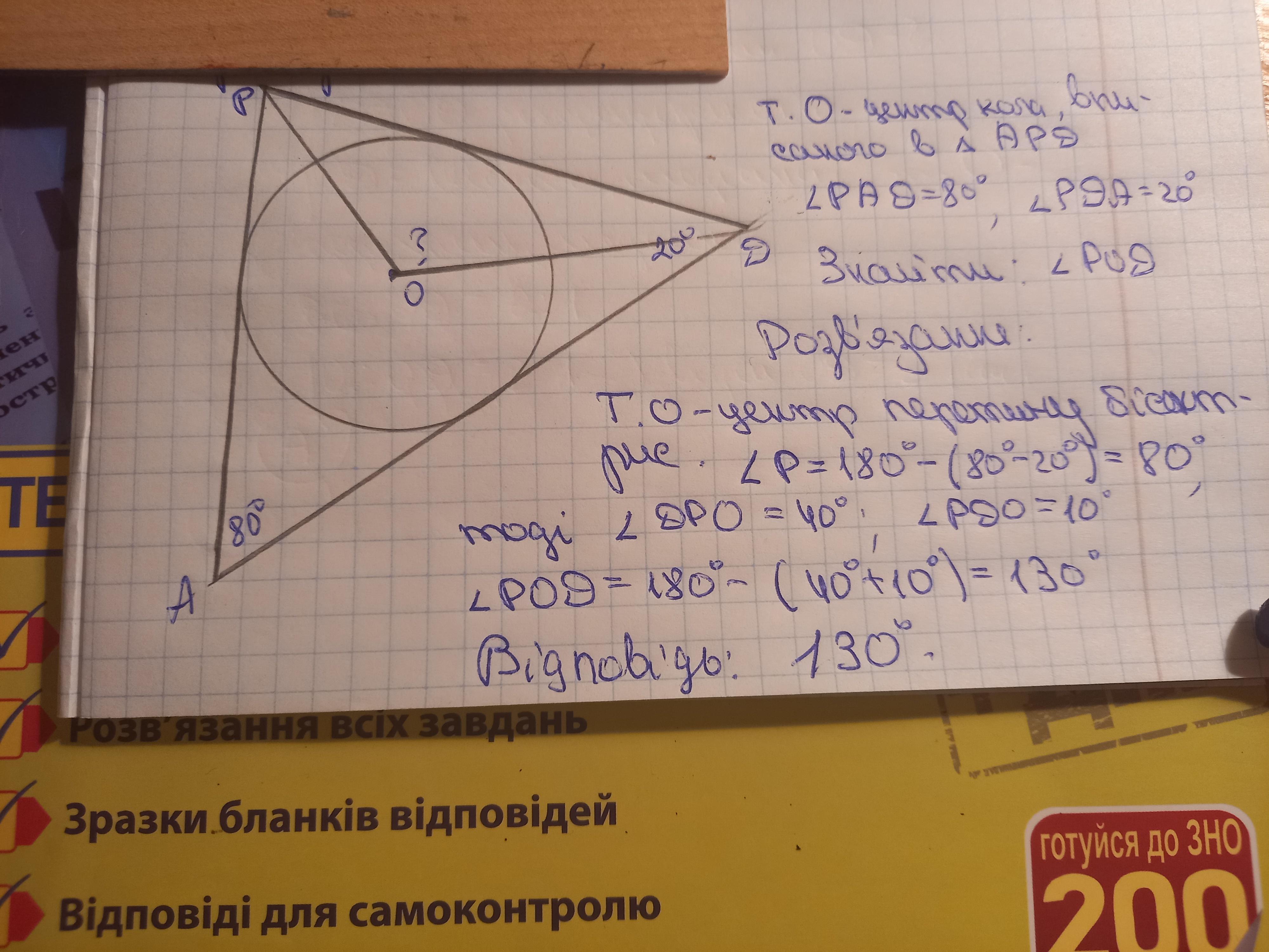 Точка O - центр кола, вписаного в трикутник APD . Кут PAD = 80°, PDA = 20°Знайти градусну міру Кут POD ?