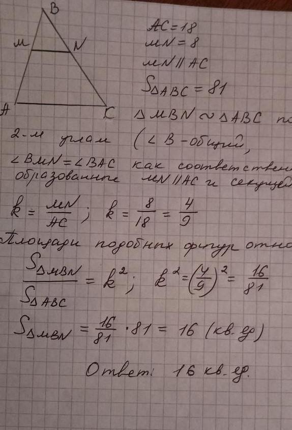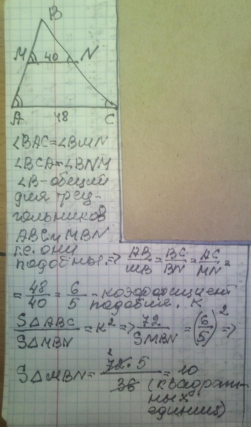 Прямая, параллельная стороне AC треугольника ABC, пересекает стороны AB и BC в точках M и N соответственно, AC = 48, MN = 40. Площадь треугольника ABC равна 72. Найдите площадь треугольника MBN.