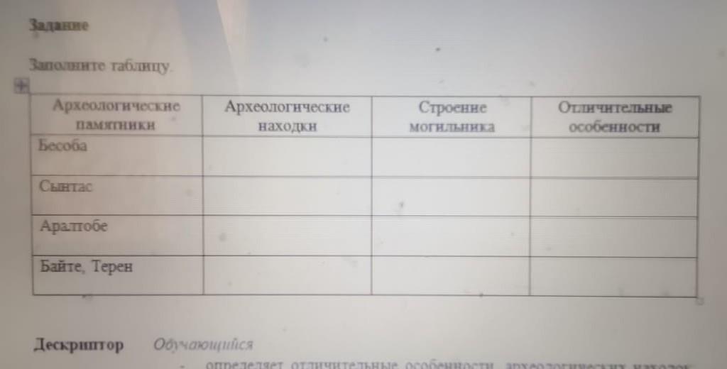 Задание Заполните таблицу Археологические Памятники Бесоба Археологические находки Строение Отличительные особенности Могильника Сынтас Аратобе Байте, Терен Дескриптор Обучаюшийся определяет отличительные особенности археологических находок определяет особенности в строенни могънков
