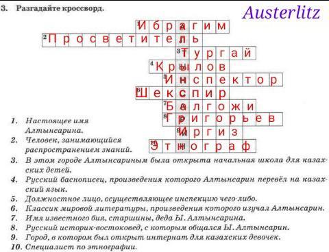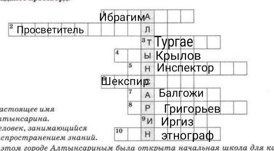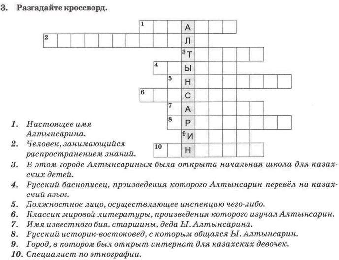 3. Разгадайте кроссворд. А 2 5 8 1. Настоящее имя Алтынсарина. 2. Человек, занимающийся распространением знаний. 3. В этом городе Алтынсариным была открыта начальная школа для казах- 10 ских детей. 4. Русский баснописец, произведения которого Алтынсарин перевёл на казах- ский язык. 5. Должностное лицо, осуществляющее инспекцию чего-либо. 6. Классик мировой литературы, произведения которого изучал Алтынсарин. 7. Имя известного бия, старшины, деда Ы. Алтынсарина. 8. Русский историк-востоковед, с которым общался Ы. Алтынсарин. 9. Город, в котором был открыт интернат для казахских девочек. 10. Специалист по этнографии.