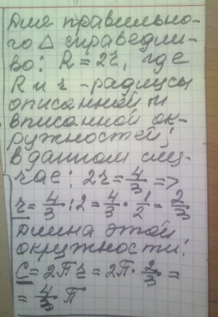 радиус вписанной окружности r=a√3/6=(4/√3)*(√3/6)=4/6=2/3, п длина окружности с=2πr=2π*2/3=4π/3