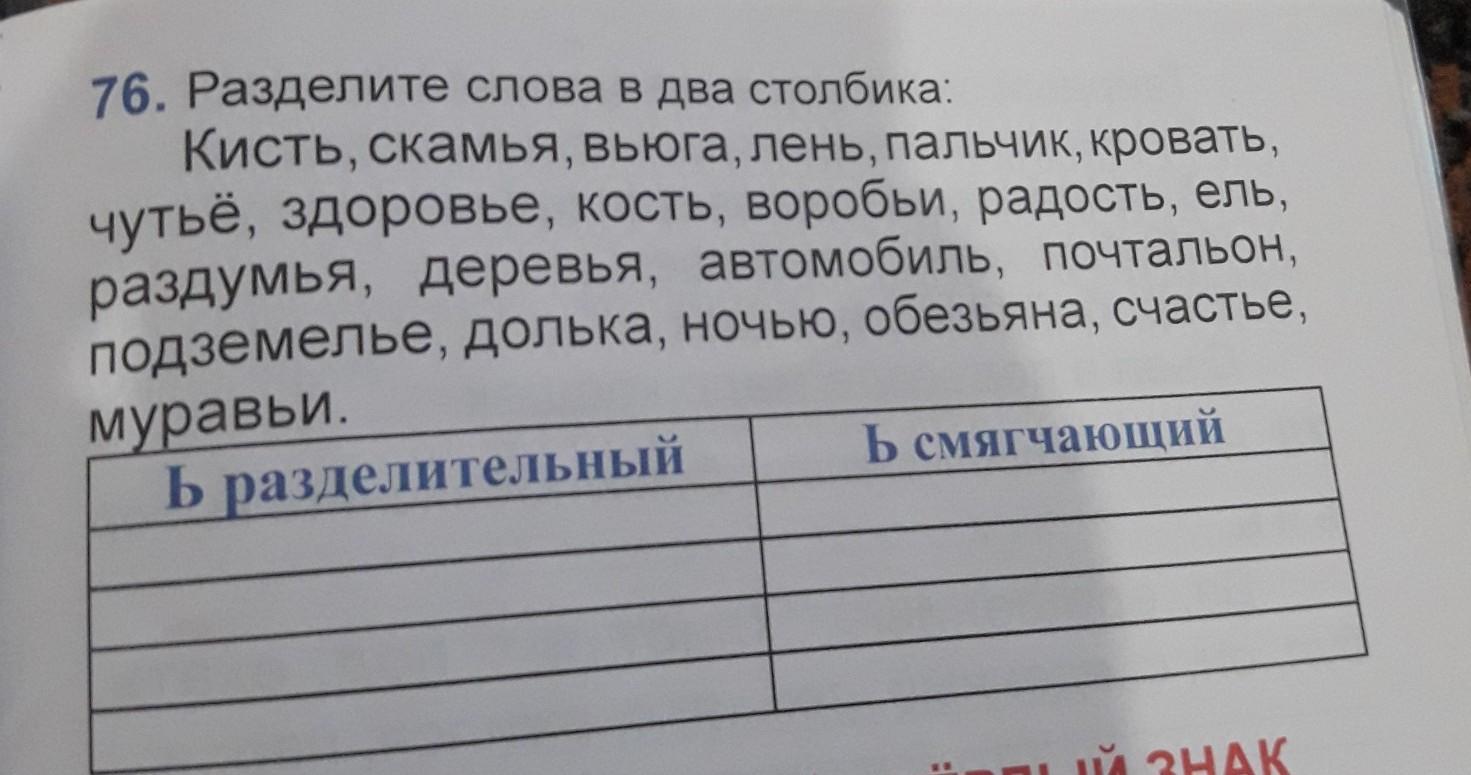 76. Разделите слова в два столбика: Кисть, скамья, вьюга, лень, пальчик, кровать, чутьё, здоровье, кость, воробьи, радость, ель, раздумья, деревья, автомобиль, почтальон, подземелье, долька, ночью, обезьяна, счастье, муравьи. Ь разделительный Ь смягчающий