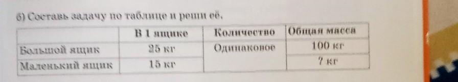 6) Составь задачу по таблице и реши ее. В 1 ящике Количество Большой ящик 25 кг одинаковое Маленькі ящик 15 кг Общая масса 100 кг 2