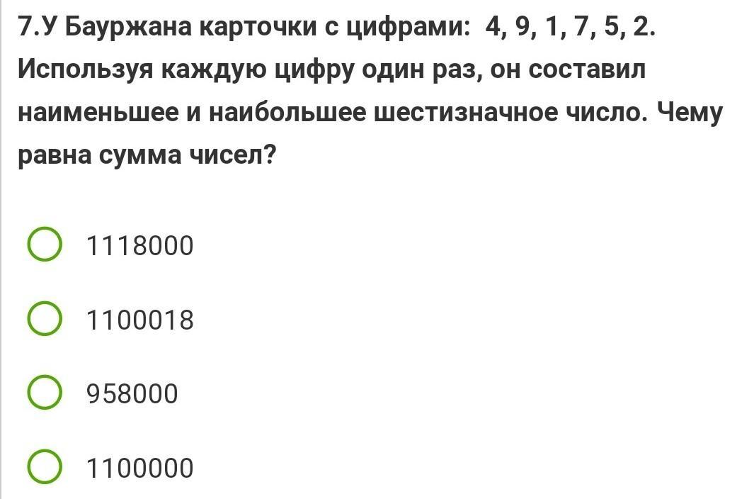 7.У Бауржана карточки с цифрами: 4, 9, 1,7, 5, 2. Используя каждую цифру один раз, он составил найменьшее и наибольшее шестизначное число. Чему равна сумма чисел? 1118000 1100018 958000 1100000, пожалуйста побыстрее