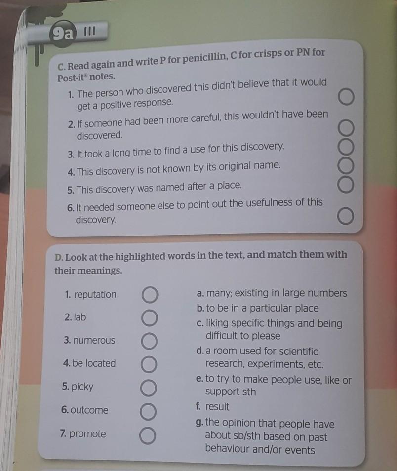 IT C. Read again and write P for penicillin, C for crisps or PN for Post-it notes. 1. The person who discovered this didn't believe that it would get a positive response. 2. If someone had been more careful, this wouldn't have been discovered. 3. It took a long time to find a use for this discovery. 4. This discovery is not known by its original name. 5. This discovery was named after a place. OOOO O 6. It needed someone else to point out the usefulness of this discovery D. Look at the highlighted words in the text, and match them with their meanings. 1. reputation 2. lab 3. numerous 4. be located a. many; existing in large numbers b. to be in a particular place c. liking specific things and being difficult to please d. a room used for scientific research, experiments, etc. e. to try to make people use, like or support sth f. result g. the opinion that people have about sb/sth based on past behaviour and/or events 5. picky 6. outcome ООО 7. promote