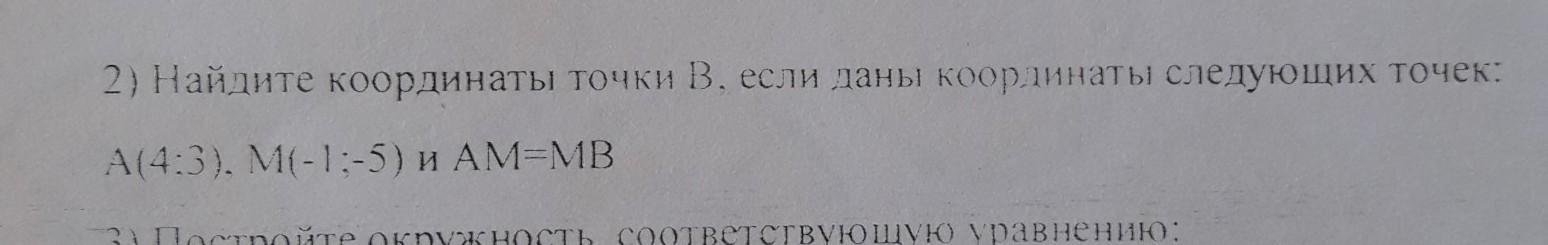 2) Найдите координаты точки В, если даны координаты следующих точек: А(4:3), M(-1;-5) и AM=MB