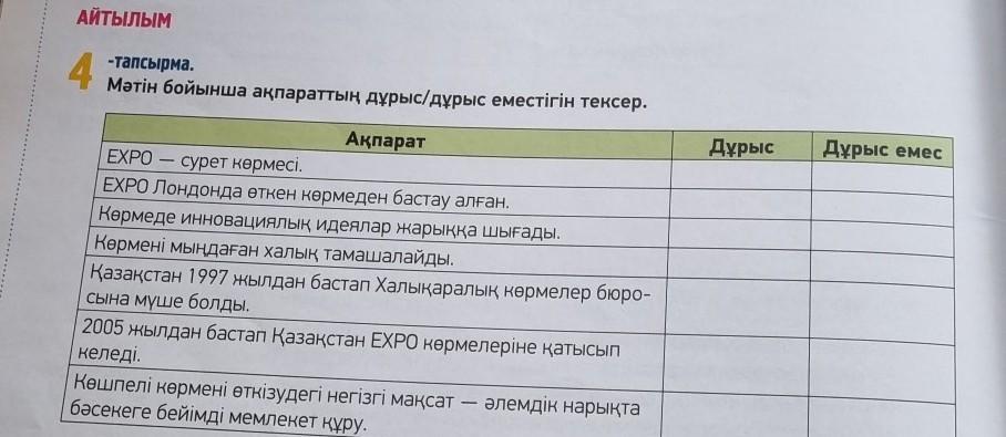 АЙТЫЛЫМ 4 -тапсырма. Мәтін бойынша ақпараттың дұрыс/дұрыс еместігін тексер. Дұрыс Дұрыс емес Ақпарат EXPO — сурет көрмесі. EXPO Лондонда өткен көрмеден бастау алған. Көрмеде инновациялық идеялар жарыққа шығады. Көрмені мыңдаған халық тамашалайды. Қазақстан 1997 жылдан бастап Халықаралық көрмелер бюро- Сына мүше болды. 2005 жылдан бастап Қазақстан EXPO көрмелеріне қатысып келеді. Көшпелі көрмені өткізудегі негізгі мақсат – әлемдік нарықта бәсекеге бейімді мемлекет құру. ТЫҢДАЛЫМ ОҚЫЛЫМ 5-тапсырма. . Мәтінді тыңда. Мәтінді пайдаланып, көп нүктенің орнын толтыр. — 1. EXPO — бүкіләлемдік бірегей ... көрме. 2. Ол 1851 жылы Лондонда өткен Бекіпало опии
