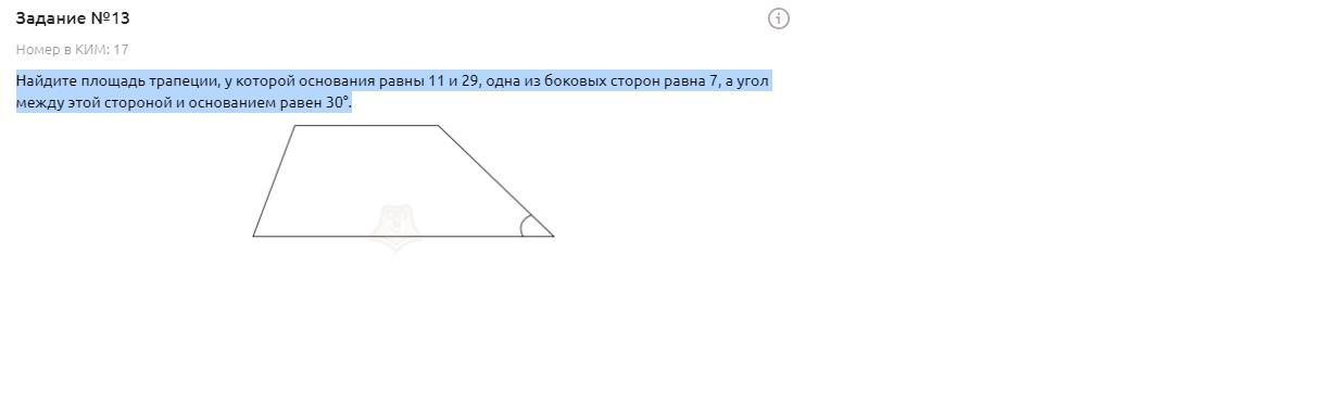 Найдите площадь трапеции, у которой основания равны 11 и 29, одна из боковых сторон равна 7, а угол между этой стороной и основанием равен 30°.