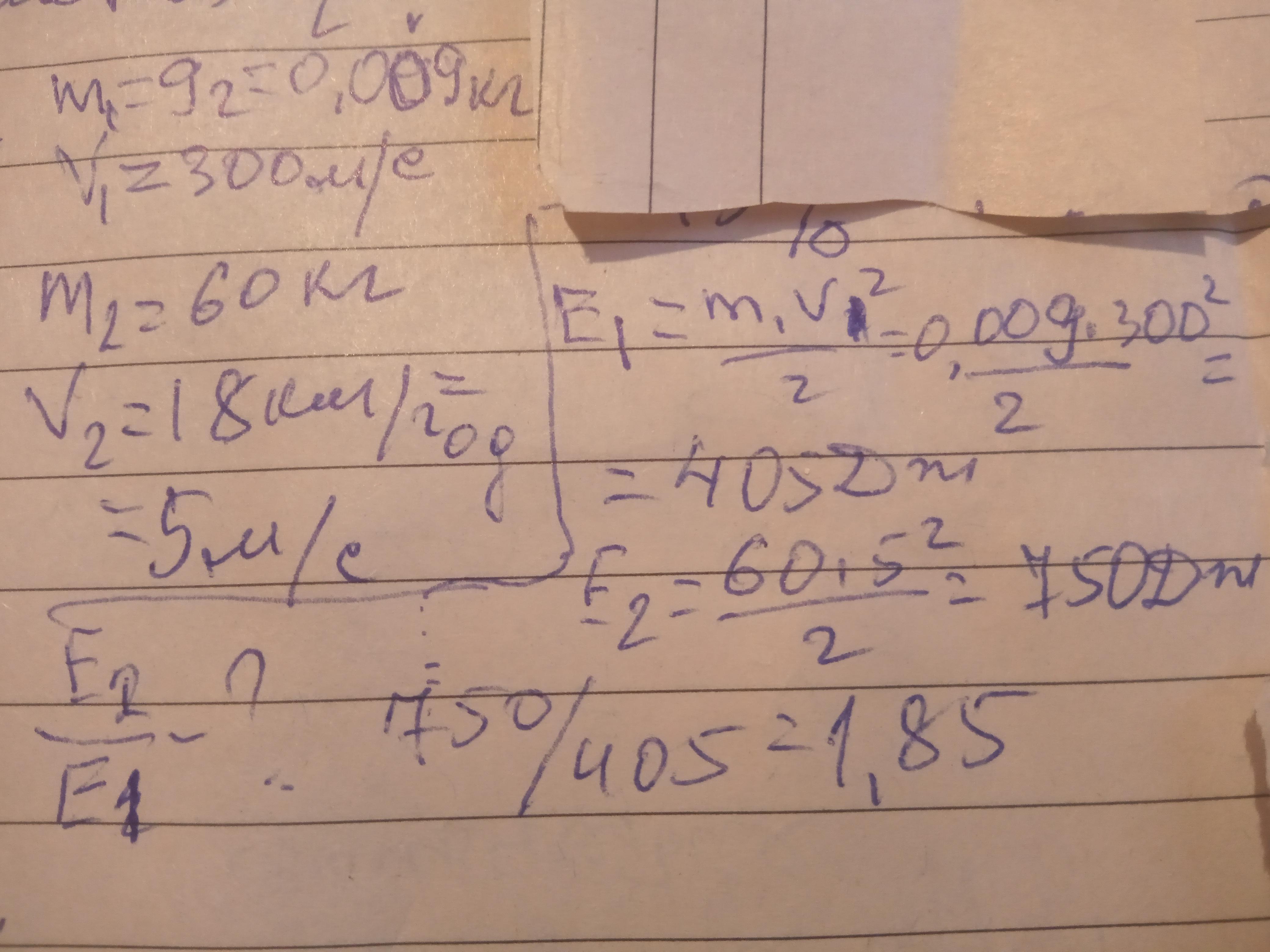 Порівняйте кінетичну енергію кулі масою 9г, що летить зі швидкістю 300м/с , і людинп масою 60 кг , що біжить зі швидкістю 18 км/год.