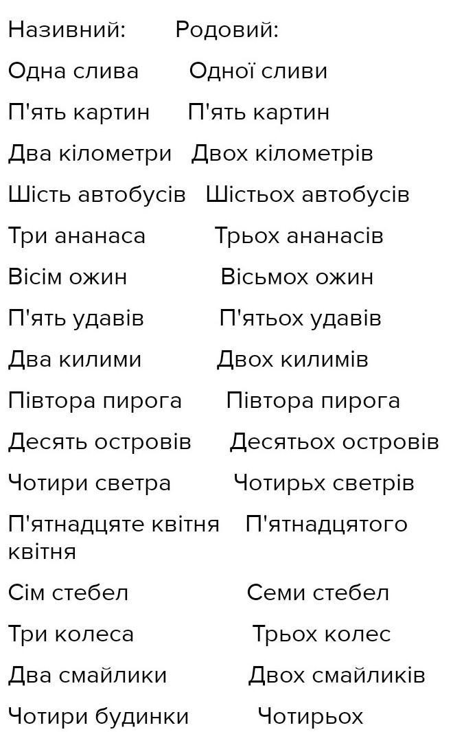 Запишіть послідовно, розкриваючи дужки, словосполучення у дві колонки: 1) у яких іменники вживаємо в називному відмінку; 2) у яких іменники вживаємо в родовому відмінку. • Одна (слива), п'ять (картина), два (кілометр), шість (автобус), три (ананас), вісім (ожина), п'ять (удав), два (килим), півтора (пиріг), десять (острів), чотири (светр), п'ятнадцяте (квітень), сім (стебло), три (колесо), два (смайлик), чотири (будинок).