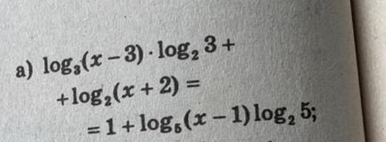\displaystyle\\\log_3(x-3) \cdot \log_23+\log_2(x+2)=1+\log_5(x-1)\cdot\log_2(5)\\\\x\in (3;\infty) \\\\\frac{\log_2(x-3)}{\log_23}\cdot\log_23+\log_2(x+2)=\log_22+\frac{\log_2(x-1)}{\log_25}\cdot\log_25\\\\\log_2(x-3)+\log_2(x+2)=\log_22+\log_2(x-1)\\\\ \log_2((x-3)(x+2))=\log_2(2(x-1))\\\\\log_2(x^2-x-6)=\log_2(2x-2)\\\\x^2-x-6=2x-2\\\\x^2-3x-4=0\\\\x_1=4 \ \ \in (3;\infty)\\x_2=-1\notin (3;\infty)\\\\\boxed{x=4}