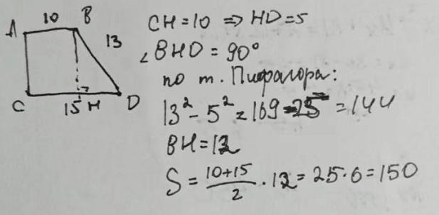 В прямоугольной трапеции основания равны 10 см и 15 см, а боковая сторона 13 см . Найдите площадь трапеции. 25 баллов.