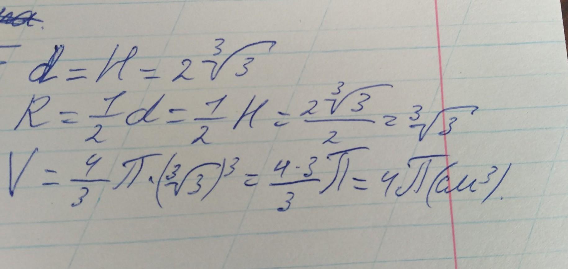 V=4πR³/3=4π*(³√3)³/3=4π см³