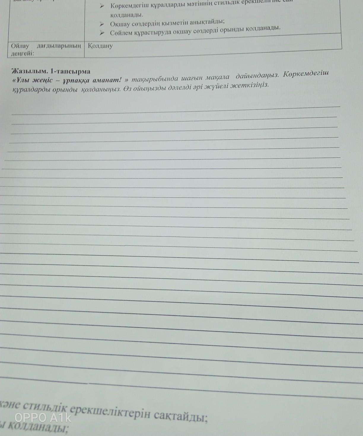 Жазылым. 1-тапсырма «Ұлы жеңіс – ұрпаққа аманат! » тақырыбында шағын мақала дайындаңыз. Көркемдегіш құралдарды орынды қолданыңыз. Өз ойыңызды дәлелді әрі жүйелі жеткізіңіз.