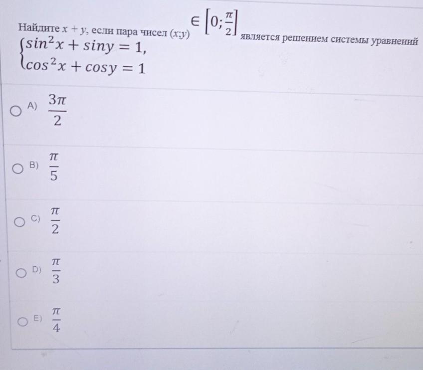 в [0; ) является решением системы уравнений E Найдител - у, если пара чисел (1:1) (sin-x + siny = 1, lcos2x + cosy = 1 З ОА) 2 TT со о 5 TT о C) 2 TT 3 17 О E) 4 Текущий предмет: Математика о