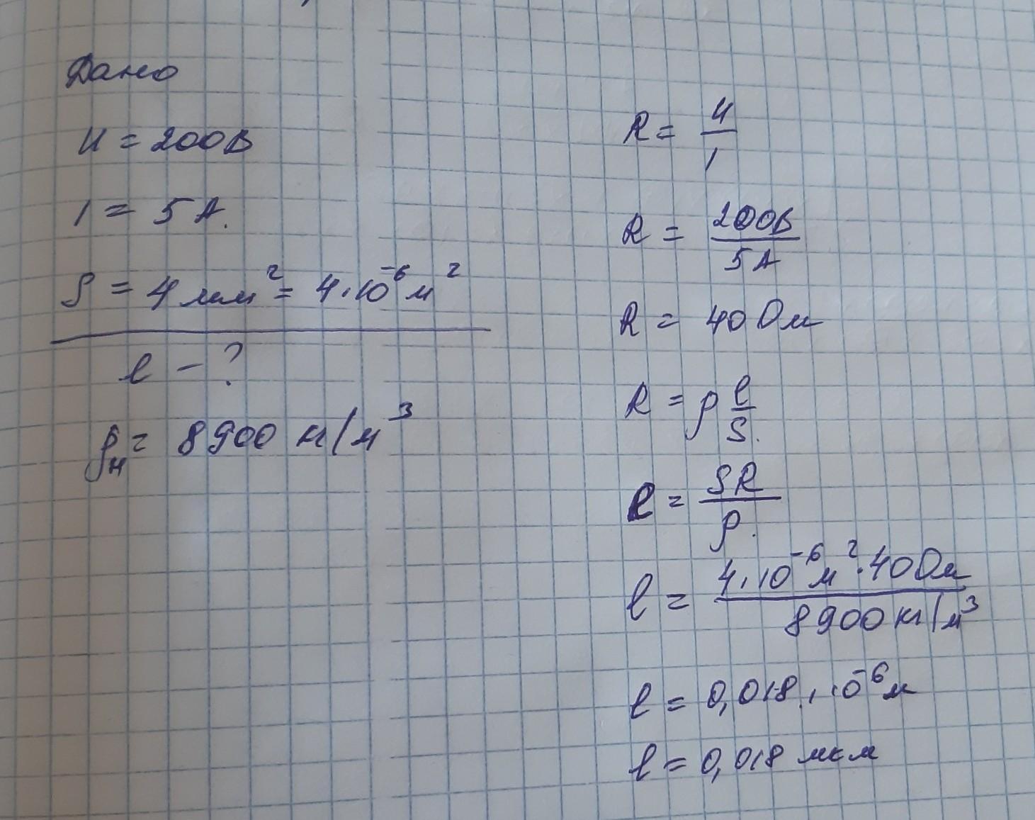 Через никелевый провод находящийся под напряжением 200В течёт ток 5 А чему равна длинна провода если площадь поперечного сечения равна 2милиметра в квадрате
