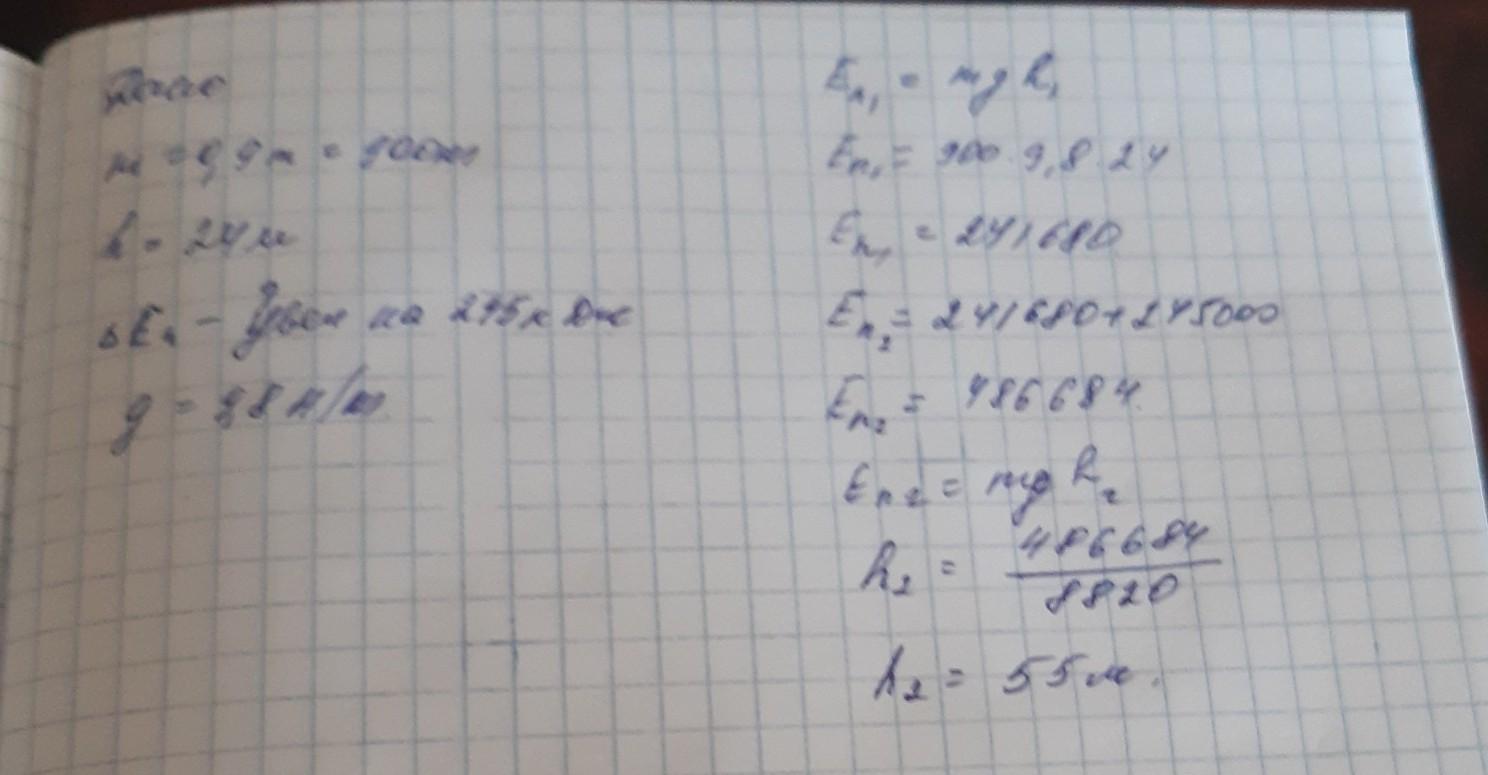 В 2006 году компания «Аэроскан» начала использовать дирижабли для пространственно-технического мониторинга местности. На какую высоту поднялся дирижабль массой 0,9 тонны с высоты 24 м, если его потенциальная энергия увеличилась на 245 кДж? (Принять g=9.8 Нкг). Ответ (округли до целого числа): дирижабль должен подняться на высоту h≈ м?