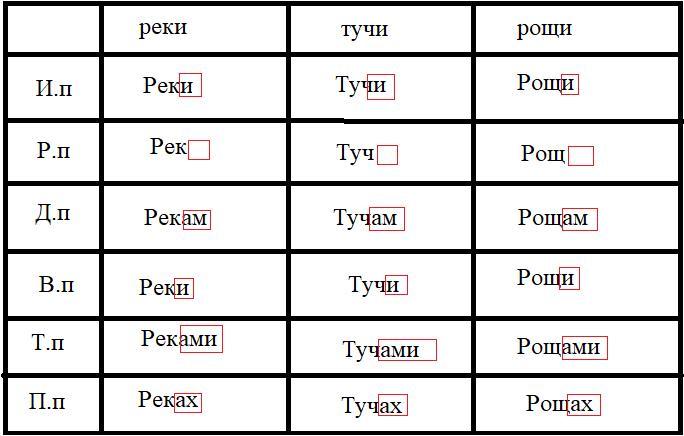 Просклоняйте письменно существительные реки, тучи, рощи.