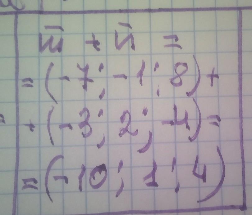 Дано вектори m(-7; -1; 8) і n (-3;2;-4). Знайдіть координати вектора m+n .