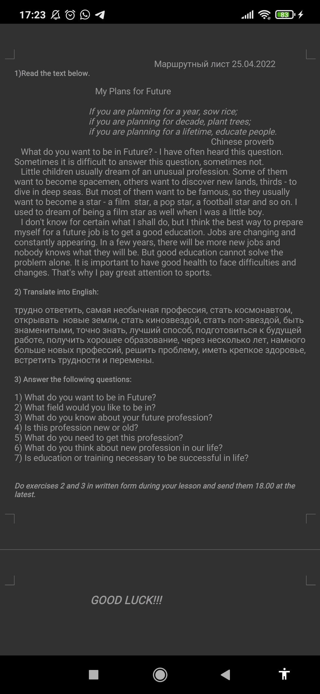 6) Что вы думаете о новой профессии в нашей жизни? I think it will help me to become successful in life.