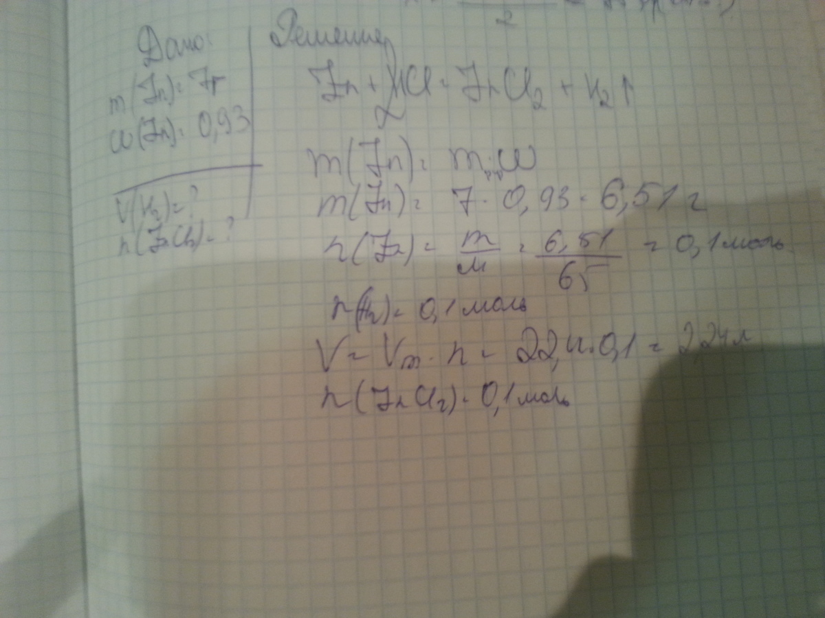 7 г технического цинка содержащего 7% примесей растворили в избытке соляной кислоты. Найдите объём полученного при этом водорода и количество соли.