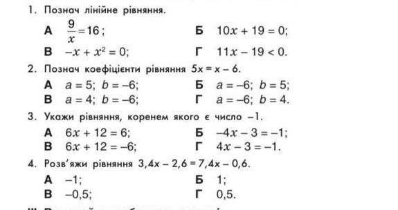1. Познач лінійне рівняння. 9 A 2 = 16; Б 10x + 19 = 0; х В -x + х = 0; г 11х - 19