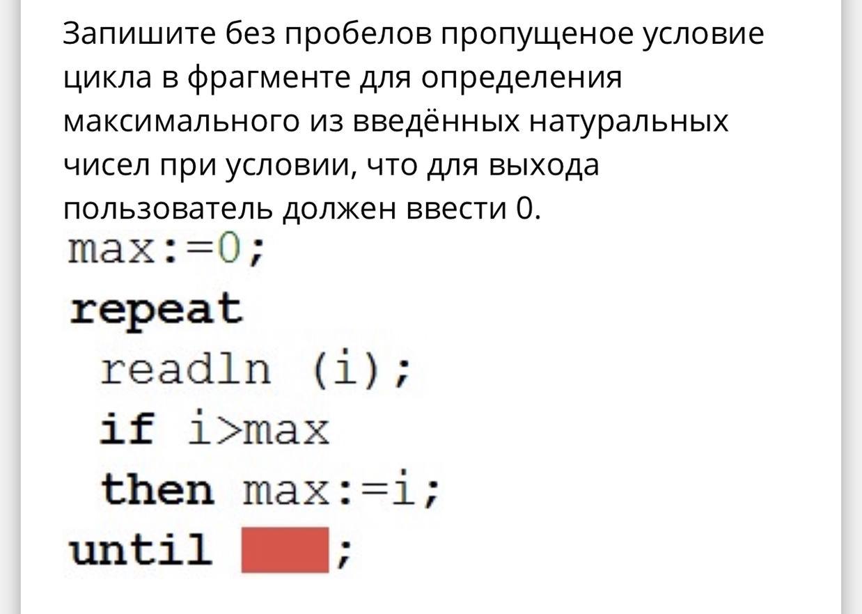 Запишите без пробелов пропущеное условие цикла в фрагменте для определения максимального из введённых натуральных чисел при условии, что для выхода пользователь должен ввести 0