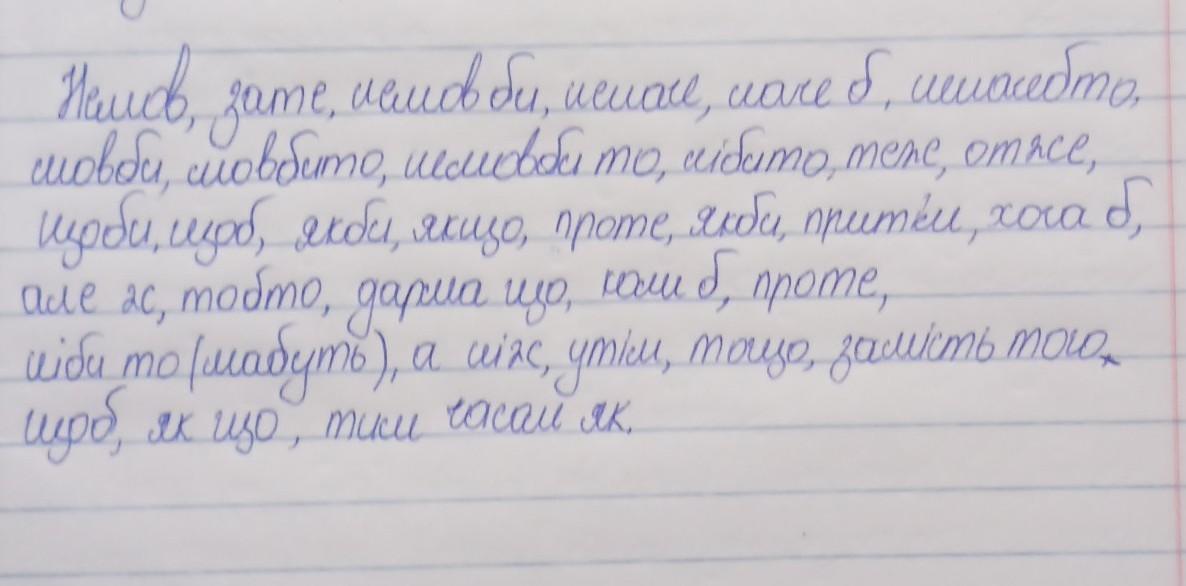 Не/мов, за/те, не/мов/би,не/наче, наче/б , не/наче/б/то,мов/би, мов/би/то, не/мов/би/то, ніби /то, те/ж, от/же, що/би, що/б, як/би, як/що, про/те, як/би, при/тім, хоча/б, але/ж, тоб/то, дарма/що, коли/б, про/те, ні/би/то, а/ні/ж, у/тім, то/що, за/мість/то го/щоб, як/що, тим/часом/як.