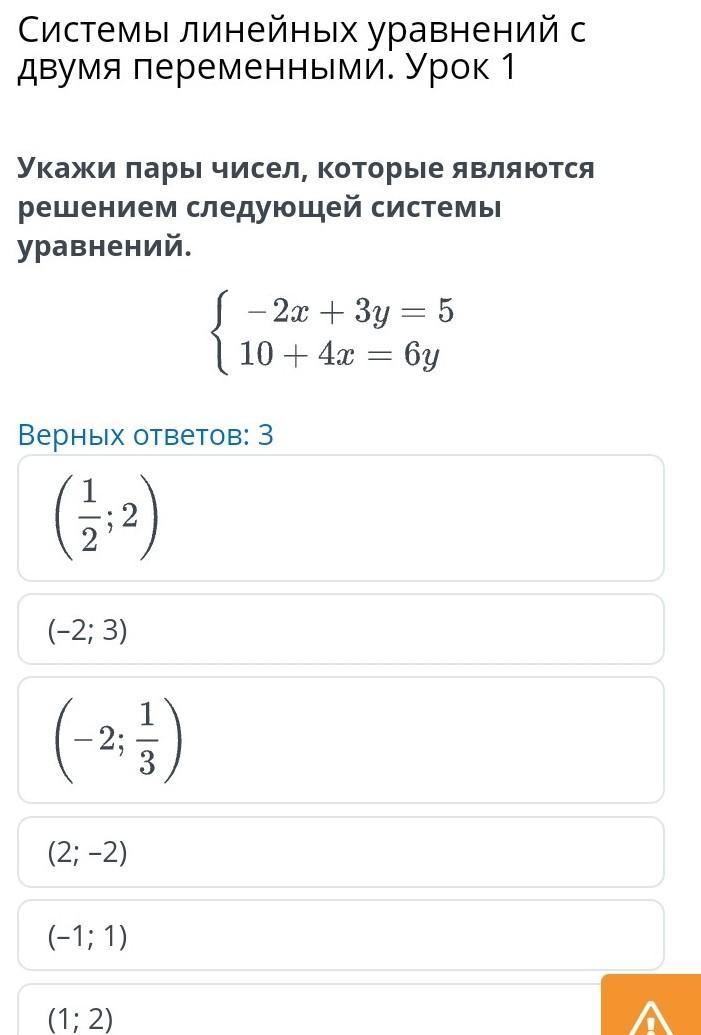 Системы линейных уравнений с двумя переменными. Урок 1 Укажи пары чисел, которые являются решением следующей системы уравнений. Верных ответов: 3 (–2; 3) (2; –2) (–1; 1)