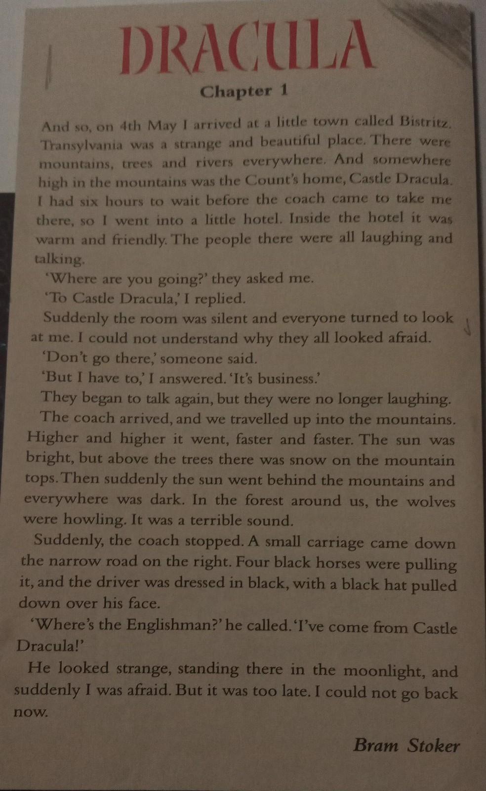 Итак, 4 мая я прибыл в городок под названием Быстриц. Трансильвания была странным и красивым местом. Повсюду были горы, деревья и реки. А где-то высоко в горах был дом графа, Замок Дракулы. Мне пришлось ждать шесть часов, прежде чем приедет карета, чтобы отвезти меня туда, поэтому я поселился в маленькой гостинице. Внутри отеля было тепло и дружелюбно. Все люди там смеялись и разговаривали.