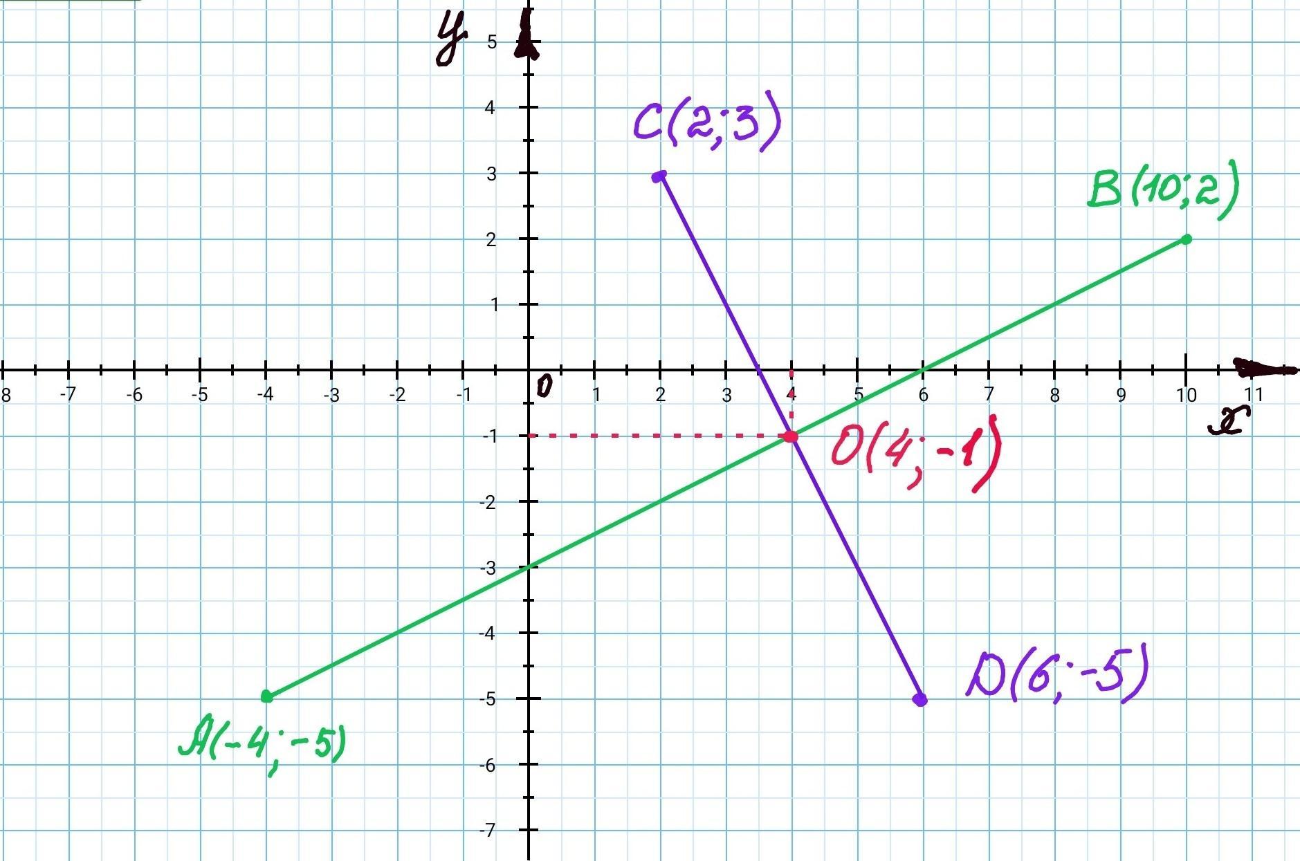 Точкой пересечения отрезков AB и CD является точка О(4;-1)