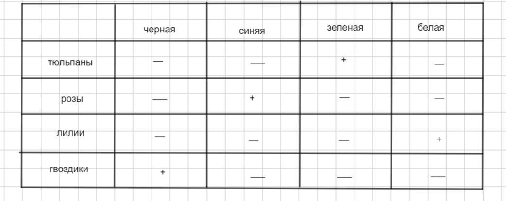 1. Если тюльпаны и розы стоят не в белой вазе, то отмечаем в таблице минусом на пересечении тюльпаны - белая и роза - белая ваза.