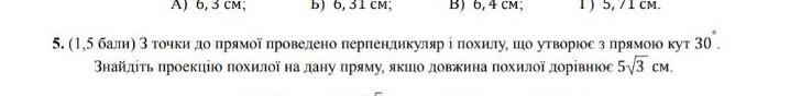 рассмотрим прямоугольный треугольник, образованный наклонной, равной 5√3 см, острым углом между проекцией и наклонной, равной 30°, и перпендикуляром, лежащим против угла в 30°, поэтому он в два раза короче гипотенузы, т.е. наклонной и равен 5√3/2