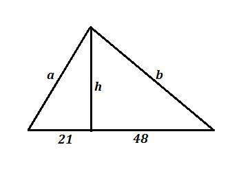 Нашли стороны, теперь найдём высоту h , опущенную на основание с=21+48=69 и площадь треугольника .
