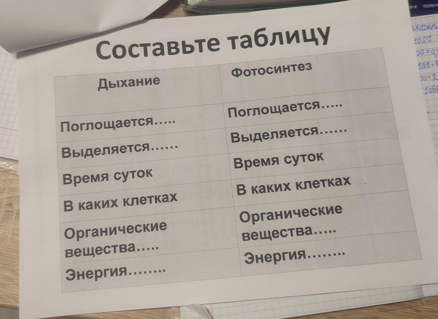 Фотосинтез - поглощается углекислый газ, выделяется кислород, время суток - день, в клетках, где есть хлорофил, органические вещества образуются, энергия поглощается.