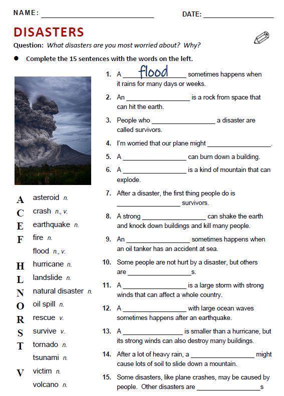Ответ: 2. An asteroid is a rock from space that can hit the earth. 3. People who survive a disaster are called survivors. 4. I’m worried that our plane might crash. 5. A fire can burn down a building. 6. A volcano is a kind of mountain that can explode. 7. After a disaster, the first thing people do is rescuing survivors. 8. A strong earthquake can shake the earth and knock down buildings and kill many people. 9. An oil spill sometimes happens when an oil tanker has an accident at sea. 10. Some people are not hurt by a disaster, but others are victims. 11. A hurricane is a large storm with strong winds that can affect a whole country. 12. A tsunami with large ocean waves sometimes happens after an earthquake. 13. A tornado is smaller than a hurricane, but its strong winds can also destroy many buildings. 14. After a lot of heavy rain, a landslide might cause lots of soil to slide down a mountain. 15. Some disasters, like plane crashes, may be causes by people. Other disasters are natural disasters.