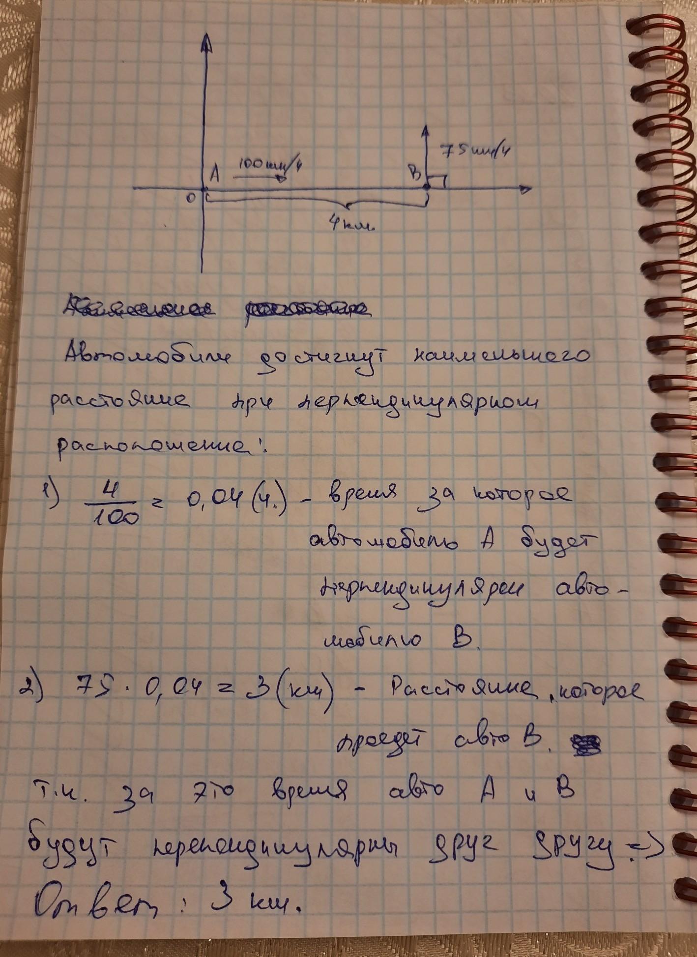 В начальный момент времени беспилотный автомобиль движется вдоль оси абсцисс в положительном ее направлении со скоростью 100 км/ч. Прямо по направлению его движения находится другой беспилотный автомобиль, который движется вдоль оси ординат в положительном ее направлении со скоростью 75 км/ч. В начальный момент времени расстояние между автомобилями – 4км. На какое наименьшее расстояние сблизятся автомобили за все время своего пути?