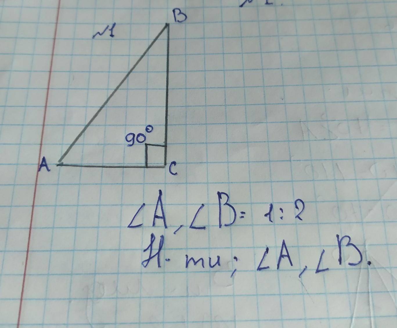 кут A=30 градусов;кут B=60 градусов.