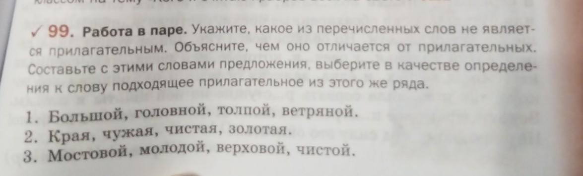 99. Работа в паре. Укажите, какое из перечисленных слов не являет- ся прилагательным. Объясните, чем оно отличается от прилагательных. Составьте с этими словами предложения, выберите в качестве определе- ния к слову подходящее прилагательное из этого же ряда. 1. Большой, головной, толпой, ветряной. 2. Края, чужая, чистая, золотая. 3. Мостовой, молодой, верховой, чистой.