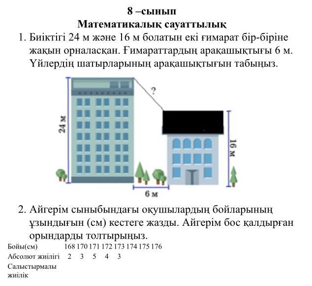 Биіктігі 24 м және 16 м болатын екі ғимарат бір-біріне жақын орналасқан. Ғимараттардың арақашықтығы 6 м. Үйлердің шатырларының арақашықтығын табыңыз.
