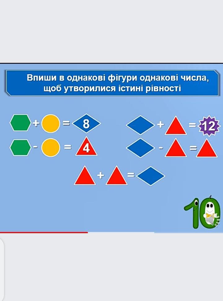 Зелёный шестиугольник это 6, жёлтый круг это 2, красный треугольник это 4, синий ромб это 8