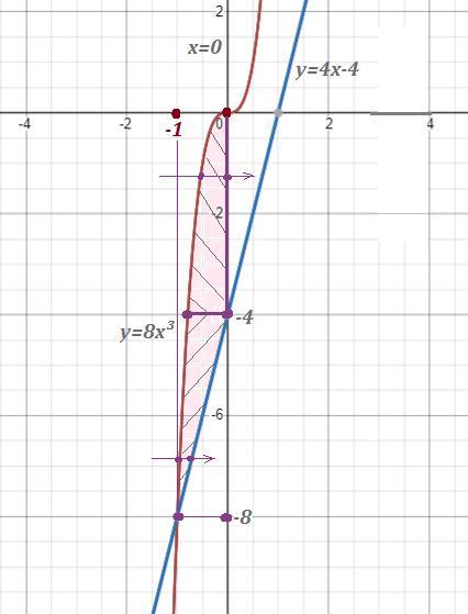 Одна проецируется в отрезок от -8 до -4 . Точка входа в эту область лежит на кубической параболе у=8х³ ⇒ , точка выхода лежит на прямой у=4х-4 ⇒ х=(y/4)+1 .
