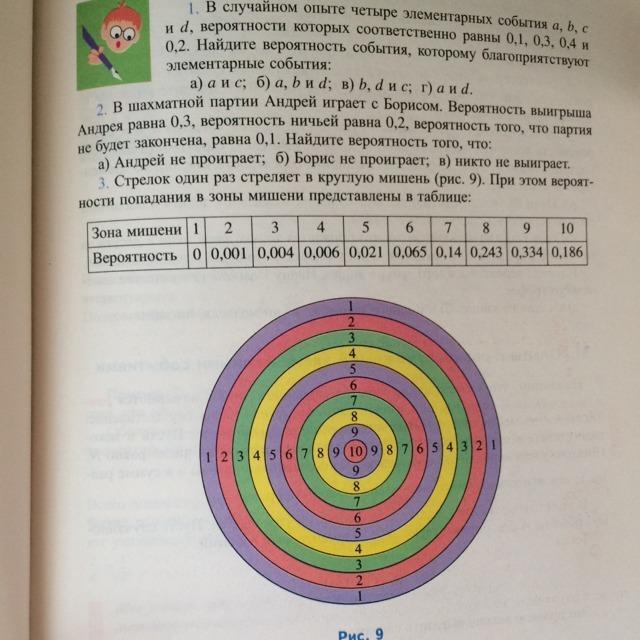 Стрелок один раз стреляет в круглую мишень. При этом вероятности попадания в зоны мишени представлены в таблице: