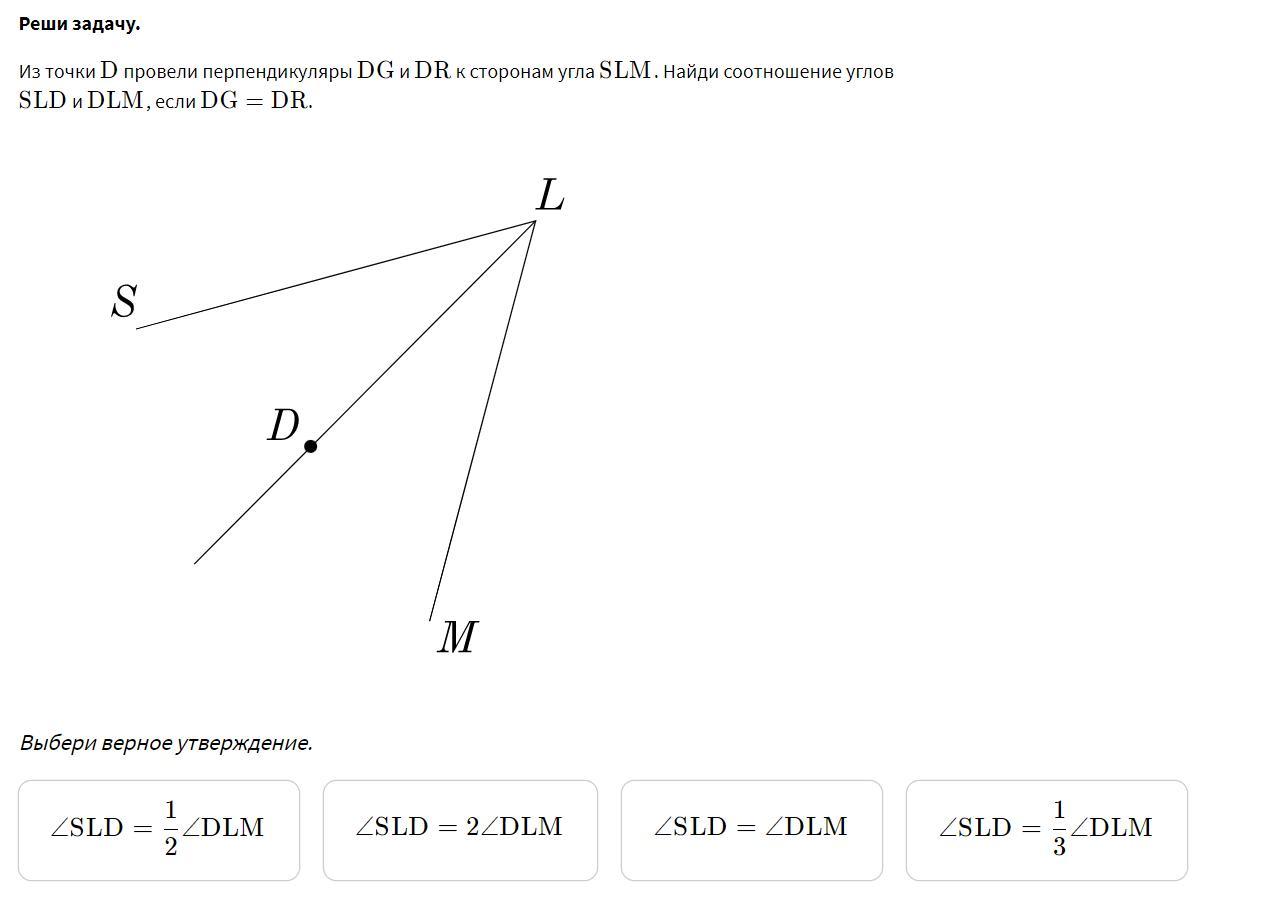 верный ответ третий, т.к. если точка, лежащая на луче LD, равноудалена от сторон угла, то она лежит на биссектрисе этого угла, а биссектриса делит угол пополам, значит, ∠SLD=∠DLM