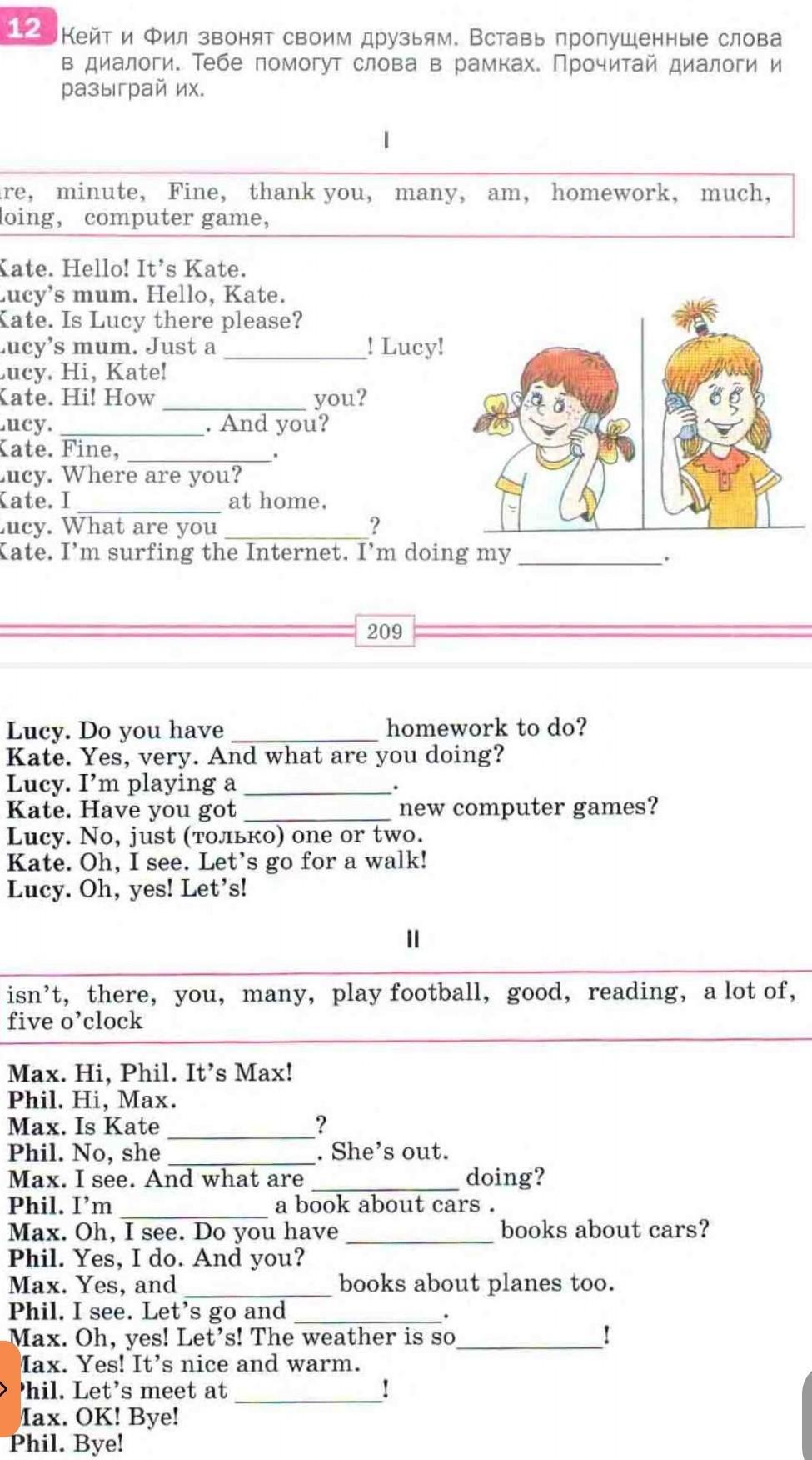 12 Кейт и Фил звонят своим друзьям. Вставь пропущенные слова В диалоги. Тебе помогут слова в рамках.