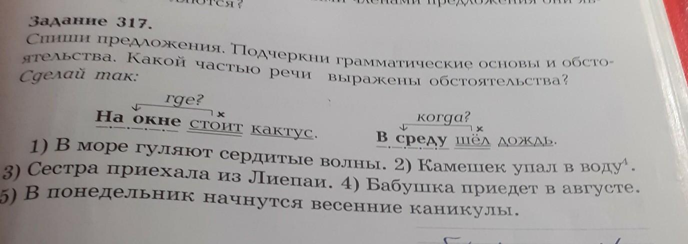 1)В море(обст.) гуляют(гл, подчёркивать двумя чертами) сердитые(прилагательное, подчёркивать волнистой линией), волны(сущ., подчёркивать одной чертой).2) Камешек(сущ, подчёркивать одной чертой), упал ( глагол, подчёркивать двумя чертами, в августе(когда? обстоятельство, подчёркиваем чёрточкой точкой)3) Сестра(сущ., подчёркивать одной чертой) приехала (гл., подчёркиваем двумя чертами) из Лиепаи(откуда? обстоятельство, подчёркиваем чёрточкой точкой) 4) Бабушка(сущ, подчёркиваем одной чертой) приедет(глагол, подчёркиваем двумя чертами) в августе (когда? обстоятельство подчёркиваем чёрточкой точкой) 5) В понедельник (когда? обстоятельство, подчёркиваем чёрточкой точкой) начнутся(глагол, подчёркиваем двумя чертами) весенние( какие? прилагательное подчёркиваем волнистой линией) каникулы( сущ., подчёркиваем одной чертой)