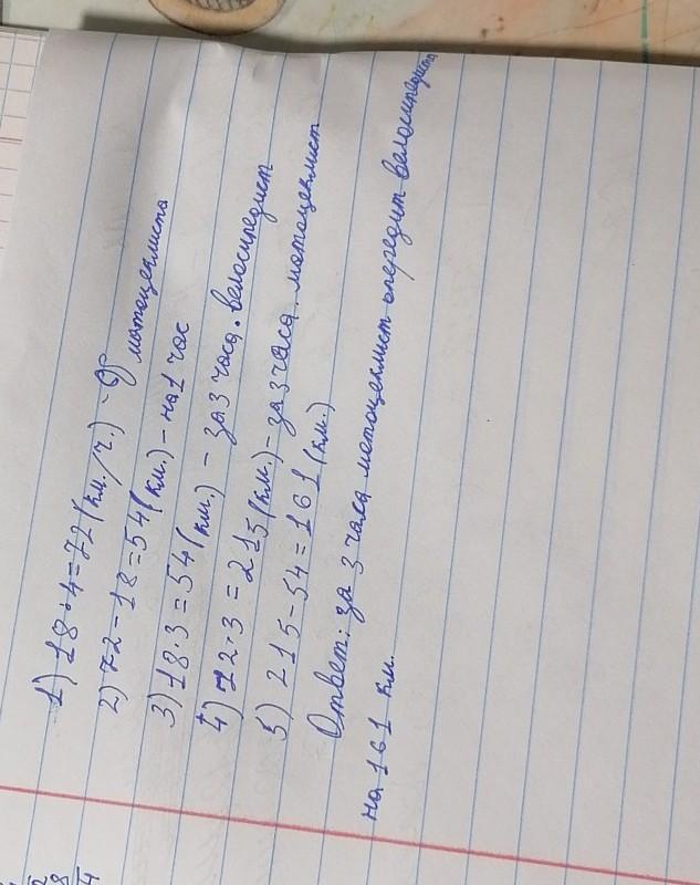 Мотоциклист и велосипедист начинают движение из одного и того же пункта в одном и том же направлении. Скорость велосипедиста за час составляет 18 км, а скорость мотоциклиста в 4 раза больше. На сколько мотоциклист окажется впереди велосипедиста через 1 час; через 3 часа?